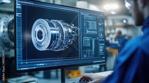 A close-up view of a desktop monitor highlights intricate designs of a prototype jet engine within 3D CAD software. Engineers discuss