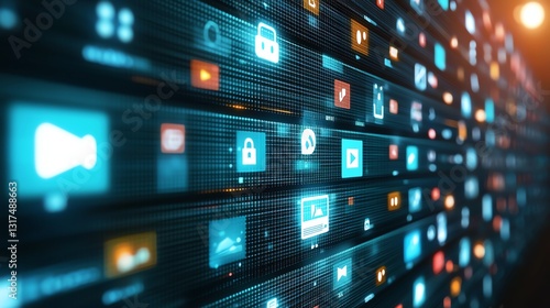 A close-up view of a digital interface displaying a variety of application icons and data streams, showcasing modern technology and connectivity in a vibrant, illuminated environme