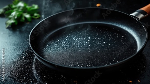 A close-up view of a frying pan with water droplets glistening on its surface, suggesting freshness and encouraging the notion of cooking with passion and enthusiasm.