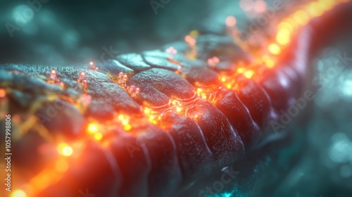 A close-up view of a glowing orange neural pathway, possibly part of a brain or nervous system, against a soft, blurred, blue-green background.