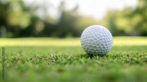 A close-up view of a golf ball resting on a vibrant green field, highlighting its texture and the surrounding grass.