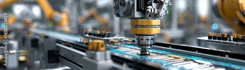 A close-up view of a high-tech robotic arm working on a production line in a modern industrial setting, showcasing automation and machinery.