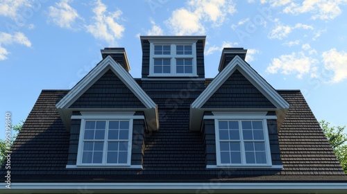 A close-up view of a house's gable roof with multiple windows under a clear blue sky.