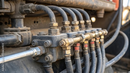 A close-up view of a machine's intricate hydraulic system, showcasing the interconnected network of pipes, valves, and connectors that control fluid pressure and flow.
