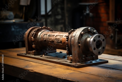A close-up view of a metallic industrial cylinder part, resting on a worn wooden table against a backdrop of rustic brick walls and vintage machinery