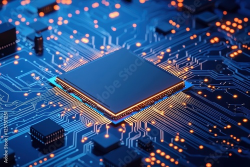 A close-up view of a microchip on a circuit board, showcasing intricate patterns and glowing lights, representing advanced technology.