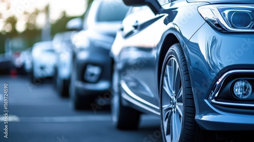 A close-up view of a modern car parked in an outdoor lot highlights the automotive industry, including used car sales, rental services, and dealerships.