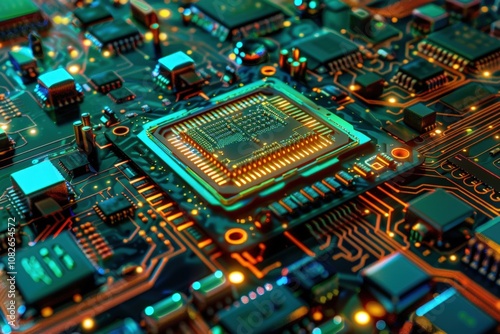 A close-up view of a modern computer circuit board illuminated by vibrant lights, showcasing intricate patterns and components during a tech-oriented exploration at night