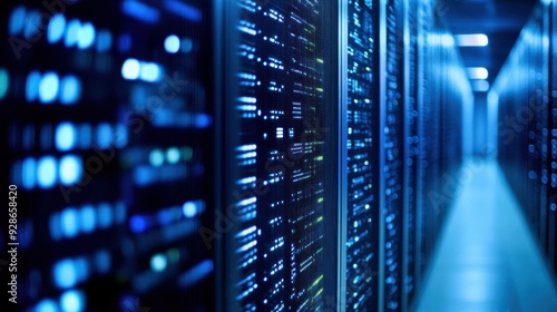 A close-up view of a modern data center with glowing server racks and cables, showcasing advanced technology and organization.