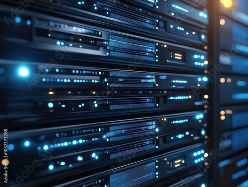 A close-up view of a modern server room with illuminated network switches and internet cables. The blue lighting creates a futuristic and tech-driven atmosphere.