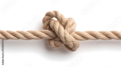 A close-up view of a neatly tied bowline knot in natural hemp rope, isolated on a clean white background
