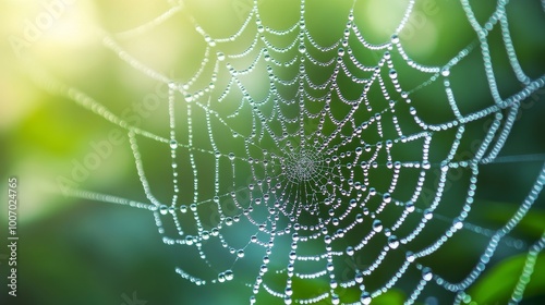 A close-up view of a spider web covered in tiny dewdrops, set against a blurry green background.