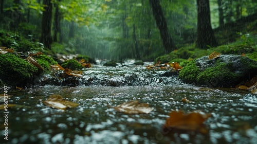 A Close-Up View of a Stream Flowing Through a Forest During a Rain Shower