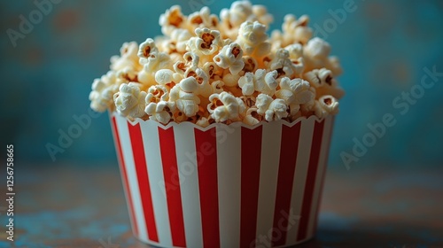 A close-up view of a striped popcorn bucket filled with fluffy popcorn against a textured blue background