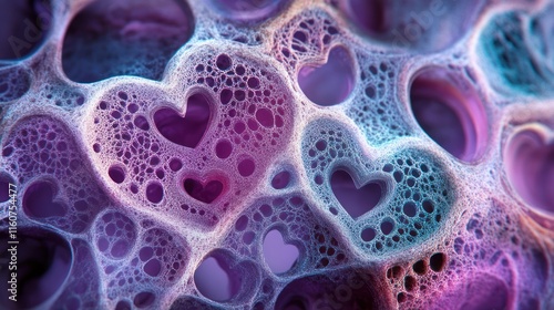 A close-up view of a textured surface featuring heart-shaped patterns in vibrant colors, emphasizing love and connection.