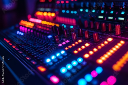 A close-up view of a vibrant electronic music mixer showcasing colorful lights and controls during a lively music production session