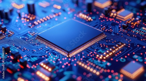 A close-up view of a vibrant, illuminated microchip on a circuit board, showcasing intricate details and technological sophistication.