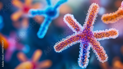 A close-up view of a virus and antibodies. These tiny organisms, like bacteria, viruses, and fungi, can only be seen with a microscope.