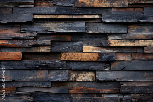A close-up view of a wall paneling design featuring dark-stained wooden planks arranged in a layered, staggered pattern