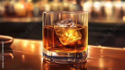 A close-up view of a whiskey glass with ice on a bar counter, illuminated by warm light
