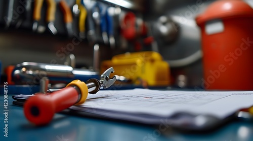 A close-up view of a workspace with various tools and equipment. A clipboard rests on a blue table, highlighting the importance of organization in an industrial setting.
