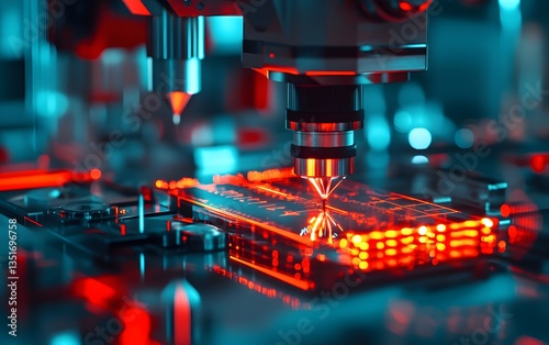 A close-up view of advanced machinery in action, showcasing precision laser technology on a circuit board with vibrant red and blue lighting, emphasizing innovation and engineering