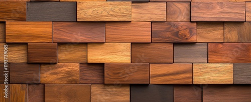 A close-up view of an artistic wooden wall showcasing a variety of rich textures and colors. Each wooden piece varies in hue, creating a warm and inviting atmosphere for any space.