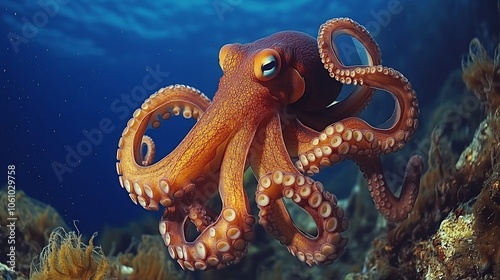 A close-up view of an octopus with a blue eye, looking directly at the camera, with its tentacles outstretched.