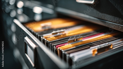 A close-up view of an open drawer filled with colorful file folders, showcasing an organized and systematic storage method.