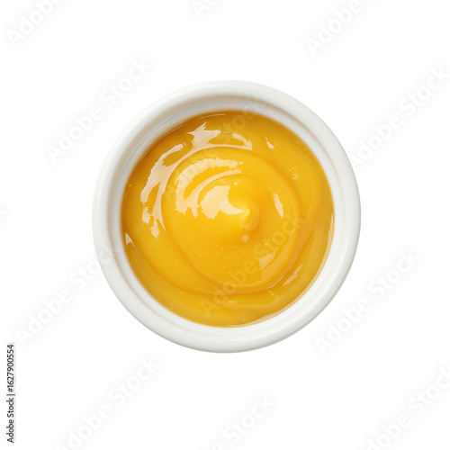 A close-up view of creamy yellow mustard in a white bowl, perfect for culinary presentations