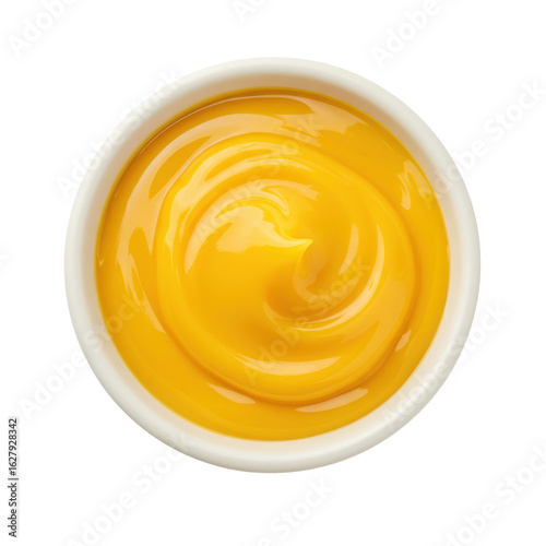 A close-up view of creamy yellow mustard in a white bowl, showcasing its smooth texture and vibrant color