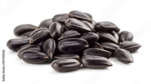 A close-up view of delicious sunflower black seeds, isolated on a clean white background, showcasing their rich texture and glossy finish