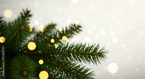 A close-up view of festive fir tree branches adorned with twinkling golden lights, surrounded by a soft bokeh effect, creating a warm and elegant holiday ambiance. background
