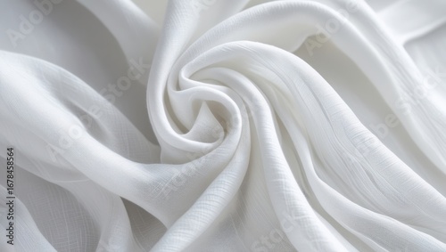 A close-up view of flowing, pure white fabric with subtle texture, exhibiting graceful folds and drapes.