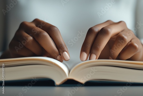 A close-up view of hands gently turning the pages of an open book, highlighting the beauty of reading and knowledge. The focus is on the intricate details of the hands and pages.