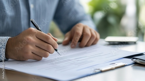 A close-up view of hands writing on a document, emphasizing business and professionalism in a modern office environment.