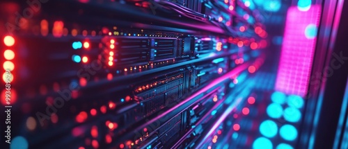 A close-up view of illuminated server racks showcasing technology and data storage.
