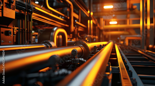 A close-up view of industrial pipes illuminated by warm lighting, showcasing a complex system within a manufacturing environment.