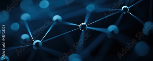 A close-up view of interconnected spheres, representing a network or molecular structure in a dark blue background.