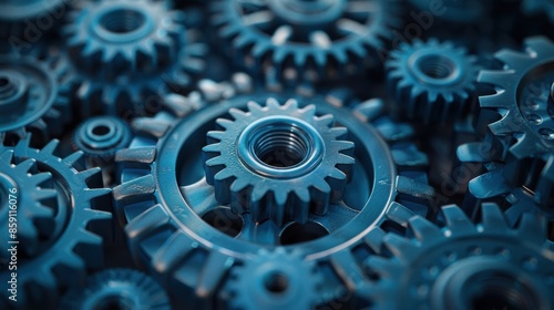 A close-up view of interlocking blue gears, showcasing the precision and intricacy of mechanical engineering with a focus on the various sizes and shapes of the gears.