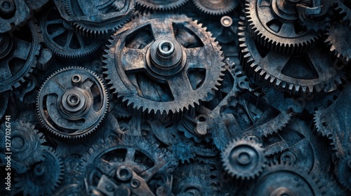 A close-up view of intricate metal gears and cogs, showcasing their detailed textures and patterns