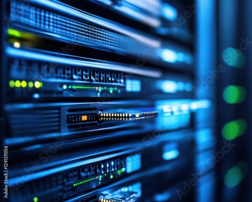 A close-up view of modern server hardware in a data center, showcasing illuminated components and advanced technology.