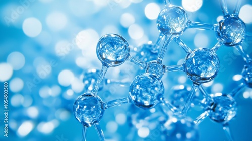 A close-up view of molecular structures with a soft blue background, showcasing interconnected spheres and a luminous effect.