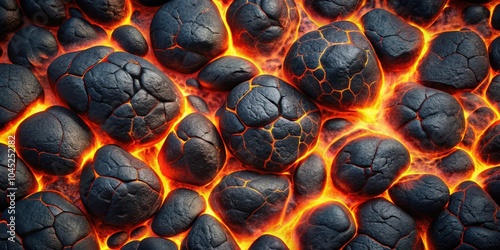 A close-up view of molten rock flowing beneath a layer of cracked and scorched stones, creating an ominous and mesmerizing display of natural power.