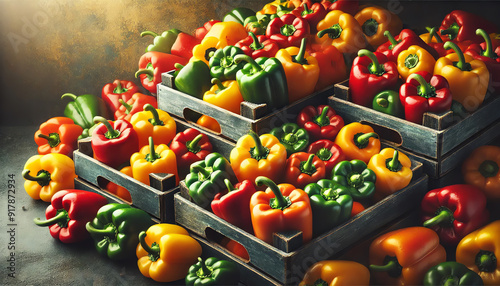 A close-up view of multiple containers filled with fresh, vibrant bell peppers