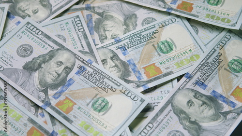 A closeup view of numerous U.S. Hundred Dollar Bills stacked together in a pile
