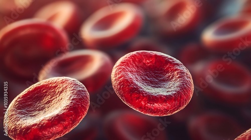 A close-up view of red blood cells floating in liquid, showcasing their distinct biconcave shape and vibrant red color.