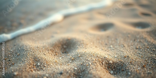 A close-up view of sand grains and a receding wave leaving a trail of white foam on a beach, revealing the intricate patterns of the seashore