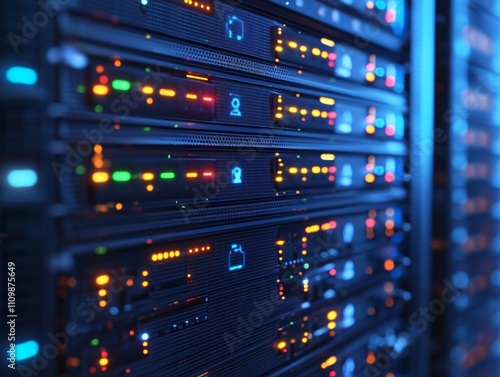 A close-up view of server racks with illuminated indicators in a data center.