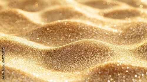 A close-up view of shimmering golden sand with soft waves and a sparkling texture.